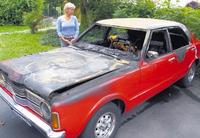 Margit Stausberg am Wrack ihres Oldtimers, der in den letzten Jahren mehrmals in der Woche ein stets zuverlässiger Begleiter war. Foto: Rauer