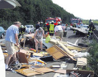 Führerlos geworden, schleuderte der Anhänger über den linken Fahrstreifen und kollidierte mit dem nachfolgenden Passat einer 42-jährigen Iserlohnerin. Durch den Aufprall wurde der Aufbau des Wohnanhängers total zerfetzt, Einzelteile flogen durch die Gegend, die Einrichtung verteilte sich über die gesamte Fahrbahnbreite.