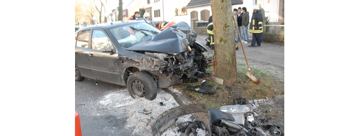 Durch die Wucht des Zusammenstoßes wurde bei dem Opel ein Teil der vorderen linken Aufhängung sowie das Rad abgerissen. Der Seat raste wie ein Geschoss über die Gegenfahrbahn und prallte frontal gegen einen Baum.