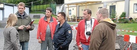 Zuvor war vor dem Haus das Erdreich entfernt worden, um die Ursache zu erforschen, warum das Wasser des Erbsenbaches am Dienstag nach dem Starkregen für die Überflutung gesorgt hatte. Schnell war klar: Ein Ast, Geröll, ein Pullover und Plastikteile hatten sich in dem Gewölbe, wahrscheinlich begünstigt durch zwei Leitungen, die mittig im Gewölbe unterhalb des Deckels verlegt worden waren, festgesetzt und so für den Rückstau verantwortlich. Nach Aussagen von Anwohnern soll es sich dabei um eine Gasleitung und Telekom-Leitung handeln, die eigentlich unter dem Gewölbe oder oberhalb des Deckels hätten verlegt sein müssen. Im Gespräch mit der Heimatzeitung widersprach Paczulla dieser Einschätzung, da Gas- und Telefonleitungen eigentlich von der Straße zum Haus geführt werden. Seiner Einschätzung nach handelt es sich um Leitungen, deren Funktion nicht geklärt ist. Das bestätigt Jörg Michutta von der Abteilung Stadtentwässerung bei der Stadt, der zum Termin am Mittwoch auch Vertreter der Stadtwerke und der Telekom eingeladen hatte. „Es wird intensiv geprüft, was es für Leitungen sind und wer dafür verantwortlich ist, dass sie nicht fachgerecht verlegt wurden. Fest steht, dass die Leitungen nicht neueren Datums sind, sondern dort schon seit 30 oder 40 Jahren liegen“.