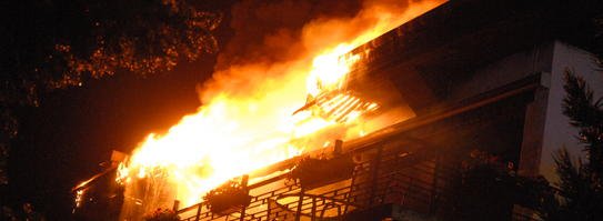 Es war gegen 1.30 Uhr am frühen Montagmorgen, als ein Gast des nahen Literaturhotels durch knisternde Geräusche geweckt wurde. Er nickte wohl noch einmal kurz ein, bevor er auf den Balkon ging, um nachzusehen: Das Flachdach des benachbarten Gebäudes stand in Flammen. Die telefonisch informierte Hotelleitung rief die Feuerwehr, so dass kurz darauf neben der Berufsfeuerwehr auch die Löschgruppen Stadtmitte, Obergrüne und Kesbern zum Brandort eilten.