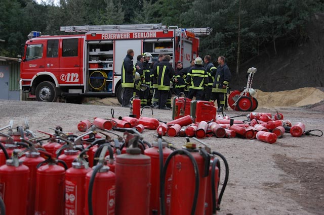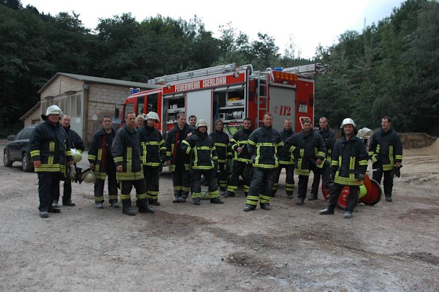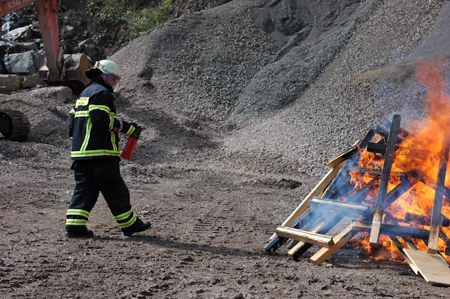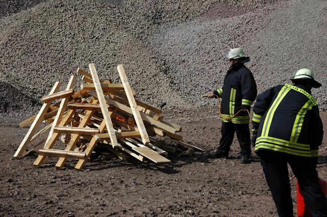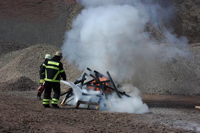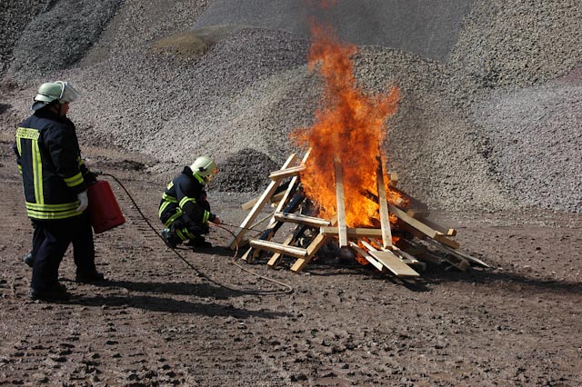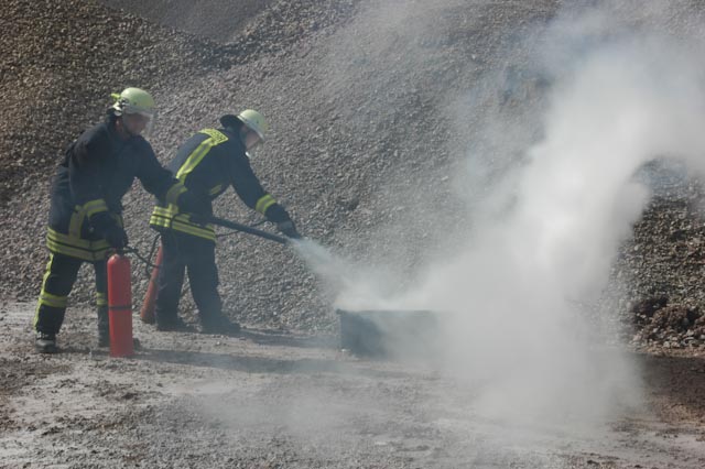 Nach einer theoretischen Auffrischung ging es zum Übungsplatz im Steinbruch Lasbeck. Entgegen unserem üblichen Vorgehen mussten wir erst mal Feuer machen, wobei ein Feststoff- sowie ein Flüssigkeitsbrand nachgestellt wurden. Daran konnten die verschiedenen Vorgehensweisen sowie die unterschiedlichen Löschmittel und deren Wirkung eindrucksvoll versucht werden.