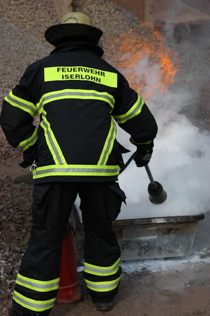 Bei unseren Übungsdienst, an dem auch Kameraden der Berufsfeuerwehr teilnahmen, trainierten wir den praktischen Umgang mit Feuerlöschern. Als Feuerwehrangehörige sind wir zwar in der Brandbekämpfung ausgebildet, jedoch haben hierzu die wenigsten bisher einen Feuerlöscher verwendet.