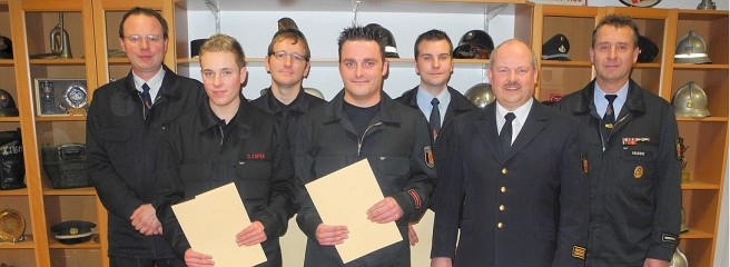 Drei der 33 theoretischen und praktischen Übungsdienste führte die Löschgruppe nicht in Letmathe durch: Zweimal wurde in der verlassenen Kraftwerkssiedlung in Werdohl-Elverlingsen die Brandbekämpfung unter realistischen Bedingungen geübt, und erstmals nach vielen Jahren gab es wieder eine gemeinsame Übung mit dem Löschzug Ergste in Schwerte. Christian Eichhorn freute sich, gemeinsam mit Jörg Krumme und dessen Stellvertreter Thorsten Denz Beförderungen vornehmen zu können: Stefan Buchen ist jetzt Oberbrandmeister, Michael Schroter Unterbrandmeister, Zum Oberfeuerwehrmann wurde Alexander Saitow ernannt, und Dominik Köper ist jetzt Feuerwehrmann.