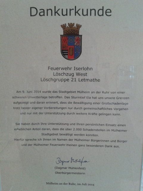 Nachrichtenansicht Post navigation ← zurück 17.11.2014Dankurkunde der Stadt MülheimDank an die Löschgruppe Letmathe von der Stadt Mühlheim zur Überörtlichen Hilfe zur Unterstützung und Beseitigung der Unwetterschäden im Juni 2014Bilder zum Beitrag: