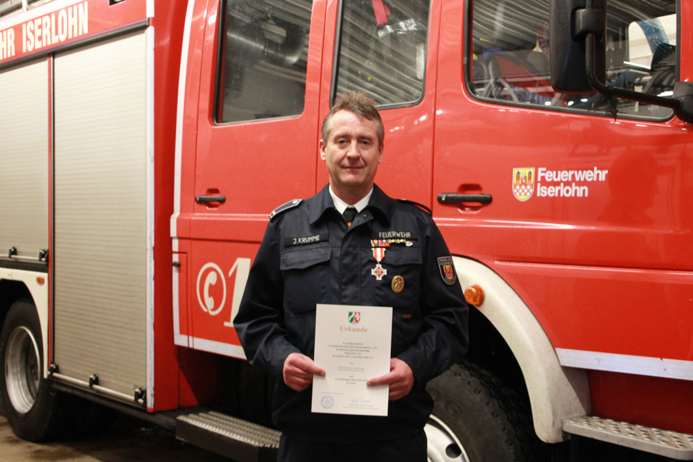 Am vergangenen Samstag wurde Jörg Krumme von dem Leiter der Feuerwehr Iserlohn, Jörg Döring für 35 Jahre aktiven Dienst mit dem Feuerwehrehrenzeichen in Gold vom Land NRW ausgezeichnet.
