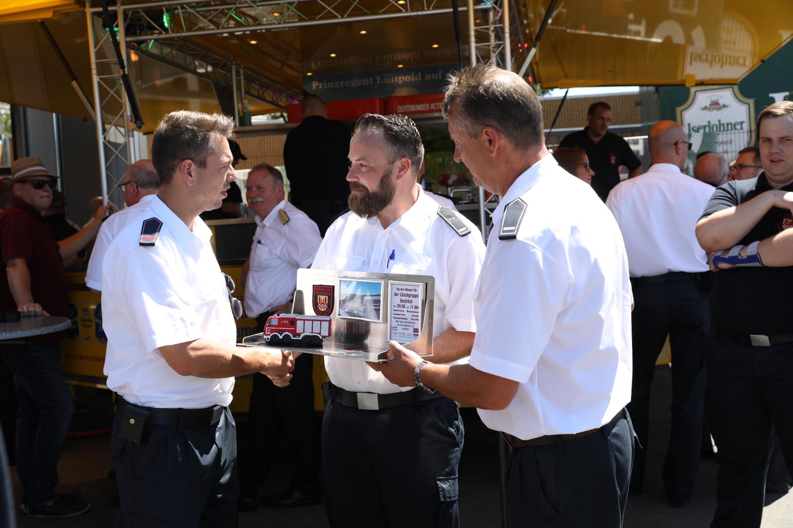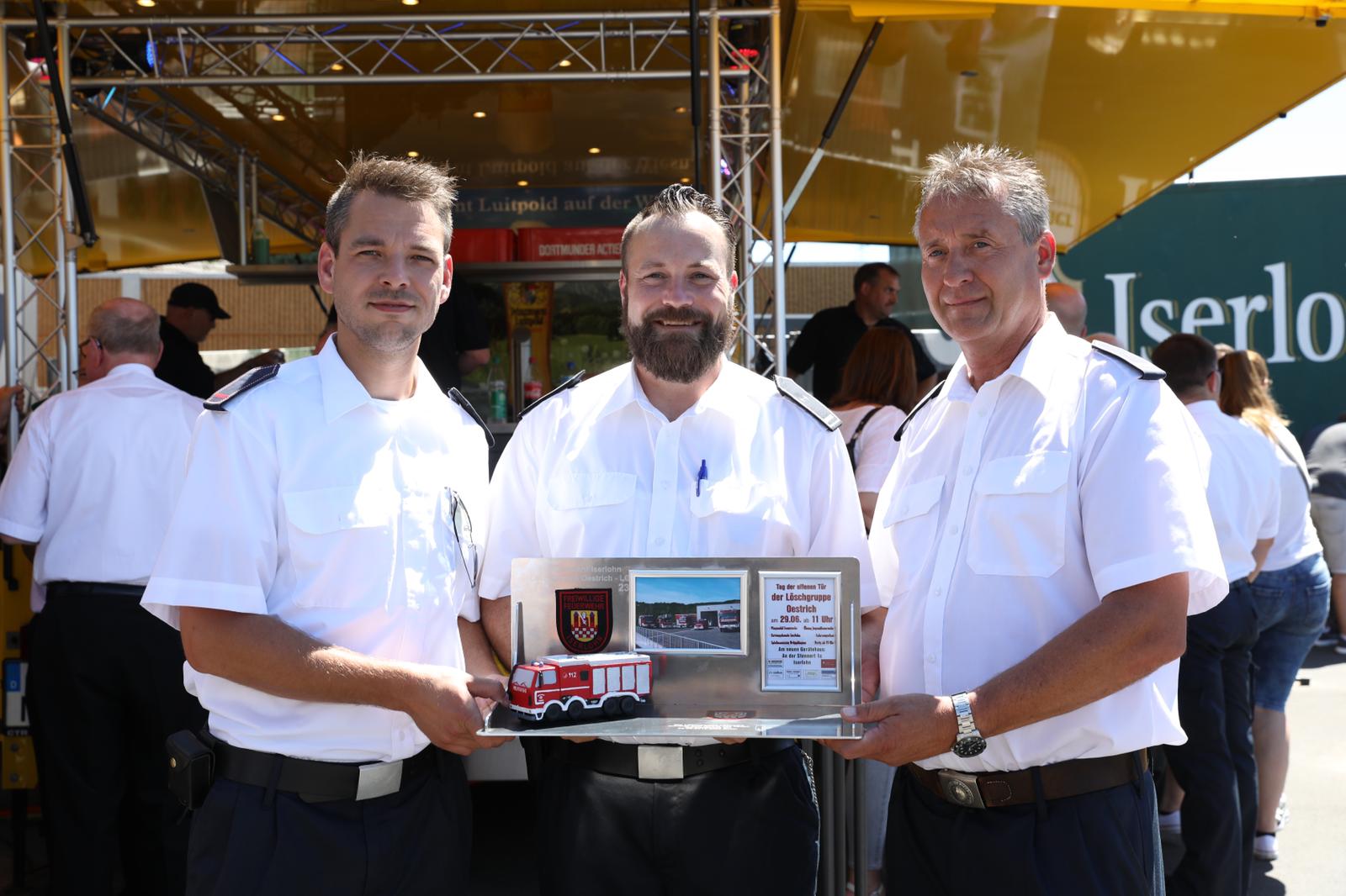 Zu den Gratulanten gehörten neben den Vertretern aus dem Rathaus und der Berufsfeuerwehr auch Brandinspektor Jörg Krumme und Brandmeister Sascha Echtermann welche dem Löschgruppenführer der Löschgruppe Oestrich Brandinspektor Christian Braun ein kleines Präsent übergeben konnten. Wir wünschen euch viel Freude mit dem neuen Gerätehaus An der Stennert.