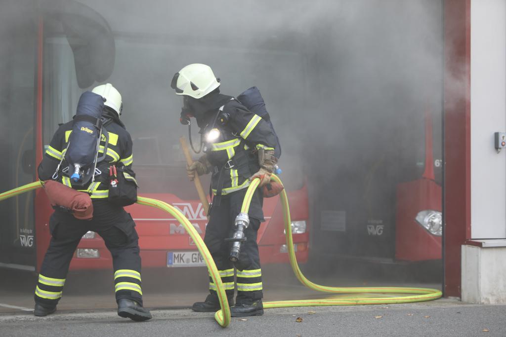 Am vergangenen Samstag führte die Löschgruppe Letmathe eine Jahresabschlussübung durch. In dem Übungsobjekt an der Oeger Straße war es war es zu einem "F1 Brand im Gebäude" gekommen, so die Alarmierung. In dem Betrieb sollten sich laut Aussagen des Betriebsleiters noch 5 Personen aufhalten. Durch den Gruppenführer HLF, BI Jörg Krumme, wurden erste Erkundungsmaßnahmen durchgeführt. Die Erkundung ergab, dass ein in der Busgarage zu einem Brand in einem geparkten Bus gekommen war. 2 Zugänge zum Gebäude wurden als Angriffswege genutzt, woraus sich eine Abschnittsbildung ergab. Das Feuer konnte durch mehrere Trupps im Innenangriff unter Atemschutz lokalisiert und die vermissten Personen aus dem Gebäude gerettet werden. "Das Übungsziel wurde erreicht", zeigte sich Löschgruppenführer BI Sascha Echtermann und sein Stellvertreter OBM Tobias Schelp zufrieden. "Dennoch sind durch die Pandemie entstandene kleinere Defizite festgestellt worden auf welche wir in den kommenden Übungen eingehen. Übungen sind für den erfolgreichen Einsatzablauf notwendig, zum Beispiel das Vorgehen als Angriffstrupp unter Atemschutz, welches in dem durch die Corona-Pandemie gezeichneten Jahr viel zu kurz kam."