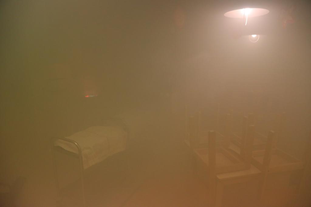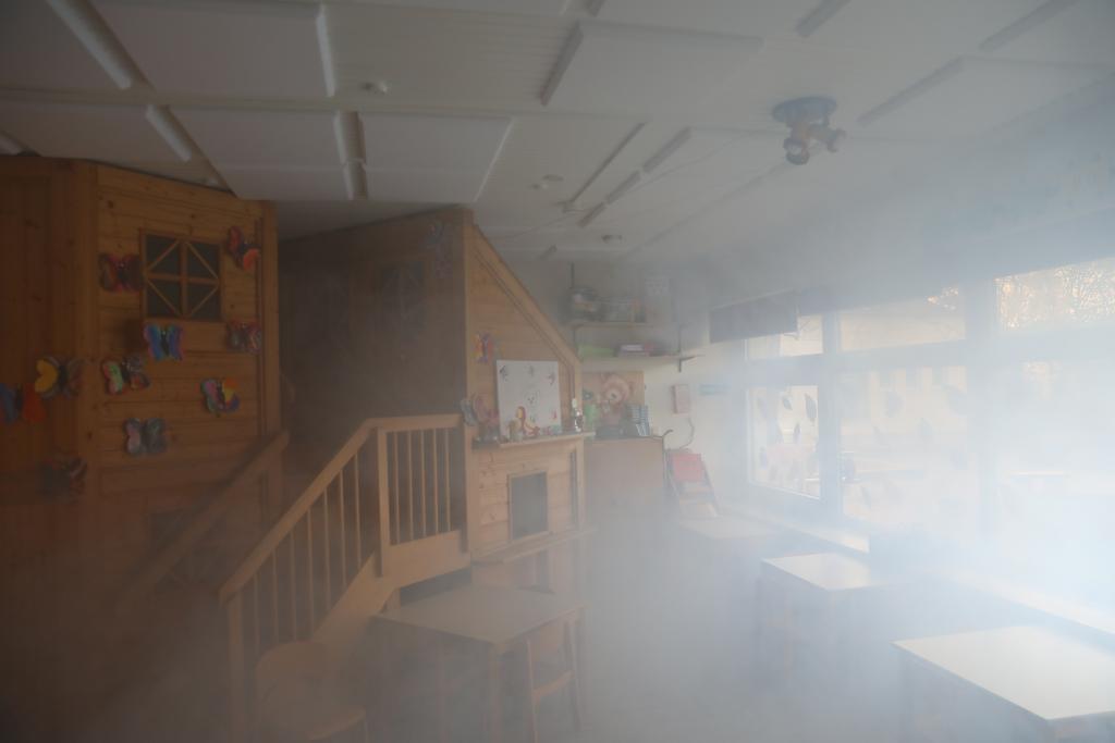 Durch eine eingeleitete Menschenrettung konnten die vermissten Personen schnell aufgefunden und ins freie verbracht werden. Das Feuer, hier durch eine Nebelmaschine und einen Flammensimulator dargestellt, wurde durch die vorgehenden Trupps unter Kontrolle gebracht.
