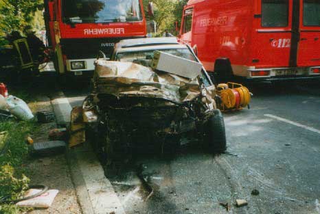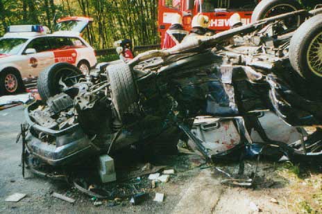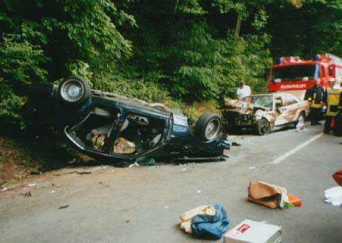2 PKW waren mit hoher Geschwindigkeit zusammen geprallt. Einer lag auf dem Dach, der andere stand schräg daneben. In beiden PKW waren insgesamt 5 Personen eingeklemmt. Eine konnte nur noch Tot geborgen werden, zwei wurden schwer und zwei leicht verletzt.
