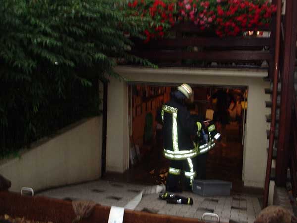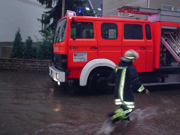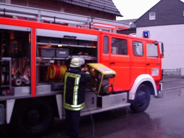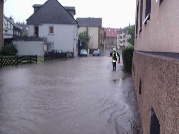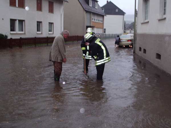 Die Bachstraße stand von Nr. 10 -19 ca. 30 cm unter Wasser auf einer Länge von 60 m. Es wurden die Gullys ausgehoben so das das Wasser von der Starße ablaufen konnte. Aus mehreren Kellern ( 40 cm unter Wasser) wurden mittels Tauchpumpe und Wasserstrahlpumpe das Wasser abgepumpt. Einige Hausbesitzer hatten selber Tauchpumpen so das in dieser Einsatzbereich relativ schnell abgearbeitet werden konnte. Außerdem wurden einige ausgespülte Gullydeckel wieder eingesetzt.