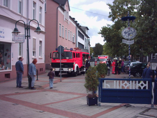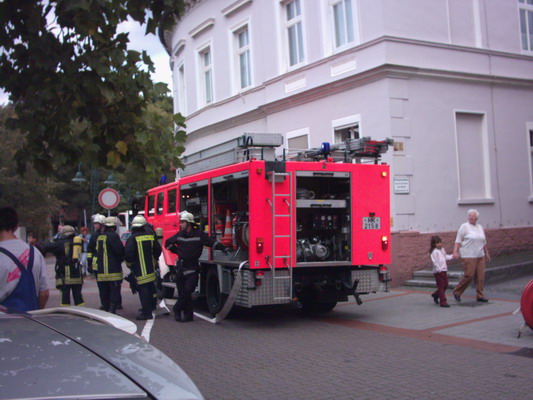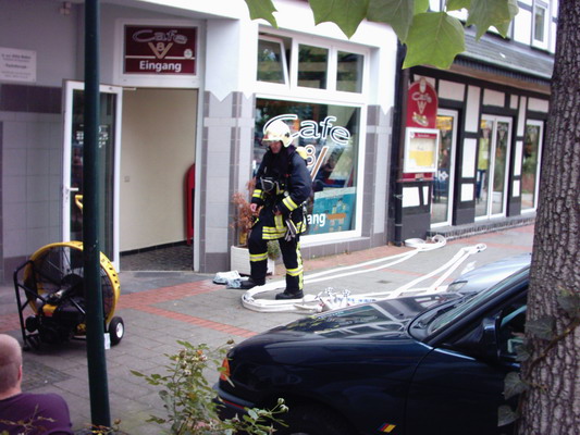 In einem Caffee / Bistro brannte ein Mülleimer mit starker Rauchentwicklung. Mehrere Personnen sprangen aus dem etwas erhöht liegenden Fenster im Erdgeschoss. Ein Anwohner aus dem angrenzenden Eiscafé löschte den Brand mit einen Pulverlöscher. Ein Trupp unter PA der LG 21 brachte den Mülleimer der bereits erloschen war ins Freie. Zur Entrauchung des Gebäudes wurde der Überdrucklüfter eingesetzt.