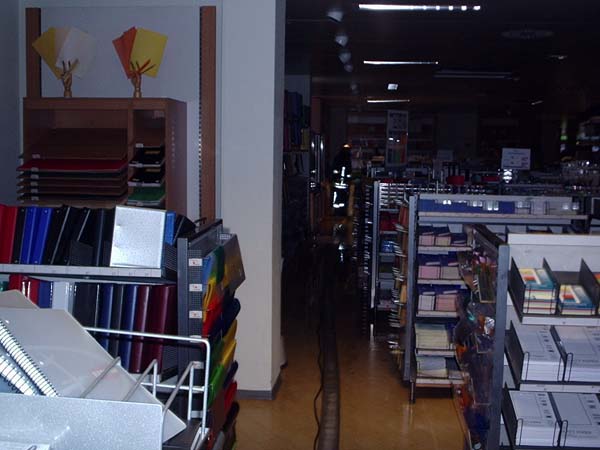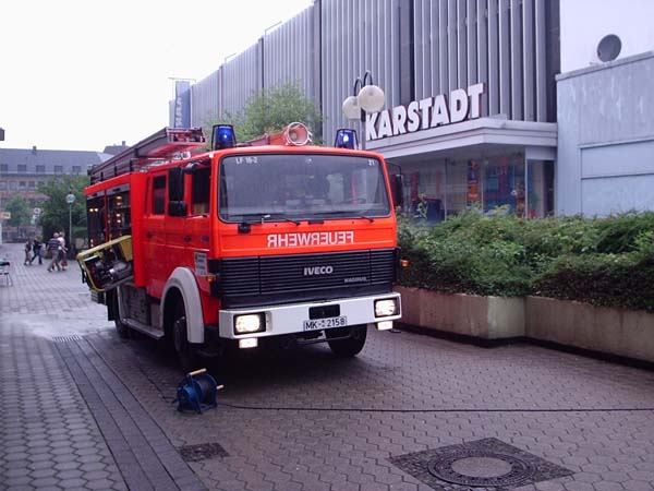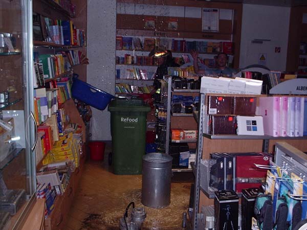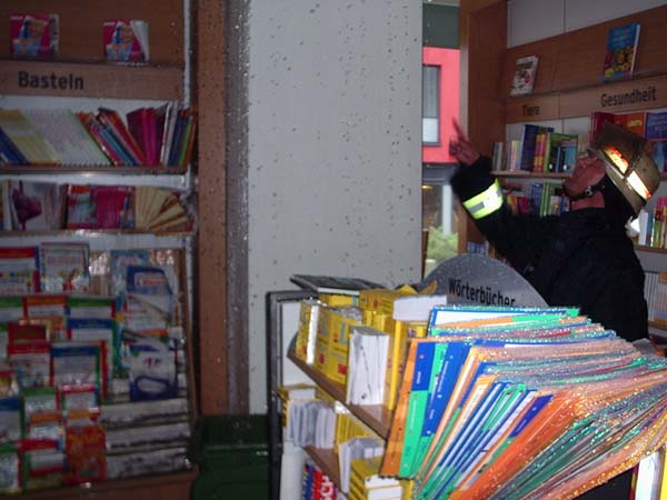 Die starken Regenfälle verursachten solche Wassermassen, daß es bei Karstadt in der Buchabteilung einen Wassereinbruch durch das Flachdach gab.