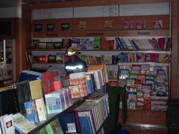 Beim Eintreffen der Löschgruppe Letmathe stand die Buchabteilung unter Wasser und das Wasser drang weiterhin durch die abgehängt Zwischendecke ins Gebäude. Es wurden Wannen und Mülltonnen unter die größten Eintrittstellen gestellt und diese dann mittels der Tauchpumpe leergesaugt.