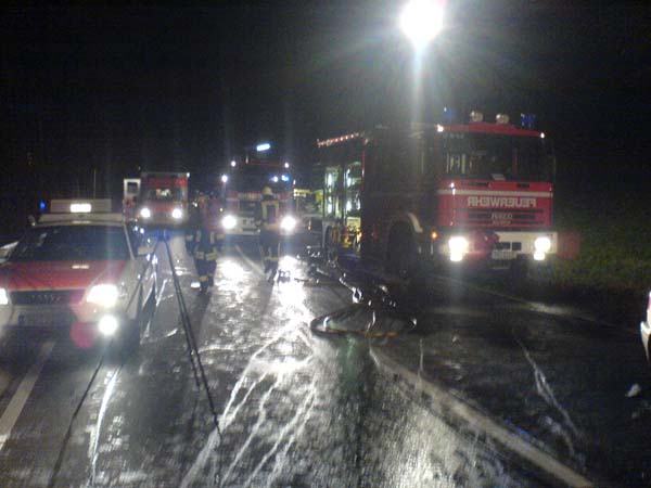Die LG21 streute noch einige auslaufende Betriebsstoffe mit Bindemittel ab und kehrte herumliegende Trümmerteile und Glasscherben zusammen. Danach wurde die Unfallstelle der Polizei übergeben, die das Abschleppen der Unfallwagen in die Wege leitete.