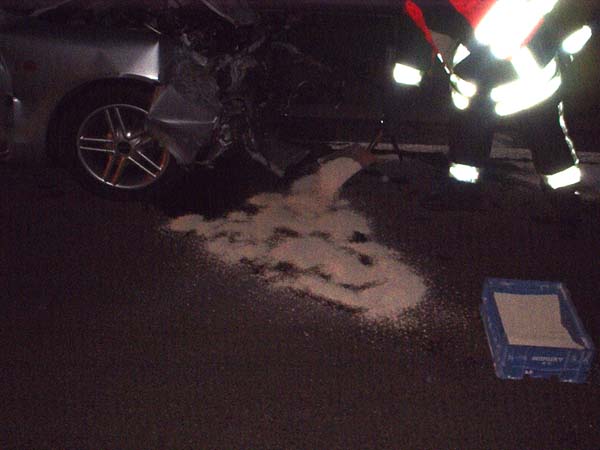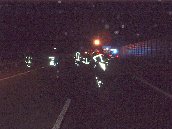 An der Einsatzstelle wurde ein dreifacher Löschangriff aufgebaut und danach die Batterie abgeklemmt. Es wurden insgesamt 4 Sack Bindemittel verbraucht um alle ausgelaufenen Betriebsmittel abzustreuen. Die BAB wurde von den Trümmern freigefegt.
