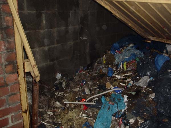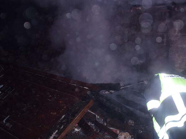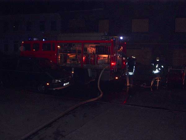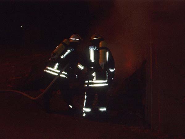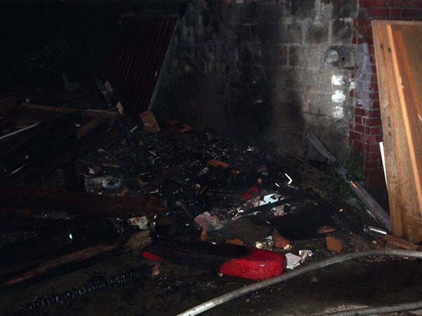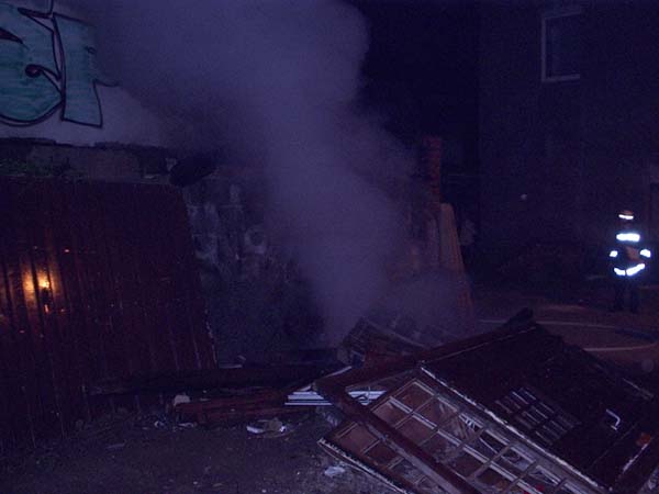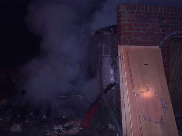 Es brannte ein Haufen Sperrmüll und Unrat neben einer Garage an der Brückenstraße. Das Feuer drohte durch Löcher in der Garagenwand auf das Innere der Garage überzugreifen. Diese war voll mit Müllsäcken voller Hausmüll und Isolierwatte.