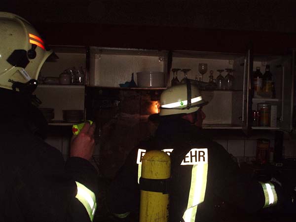 Ein Trupp der LG 21 ging unter PA mit einem C Rohr ins erste OG vor und löschte das Feuer mit wenigen Sprühstößen. Es brannten die Oberschränke und die Abzugshaube der Küche. Um an alle Glutnester zu kommen wurden einige Schränke von der Wand genommen. Mit der Wärmebildkamera wurde die Wand kontrolliert. Die Wohnung wurde mit dem Überdrucklüfter belüftet. Die Einsatzstelle wurde anschließend den Hausbewohnern übergeben mit dem Hinweis, dass Sie die Wohnung vorerst nicht nutzen können. Die BF blieb in Bereitstellung und konnte wieder einrücken.