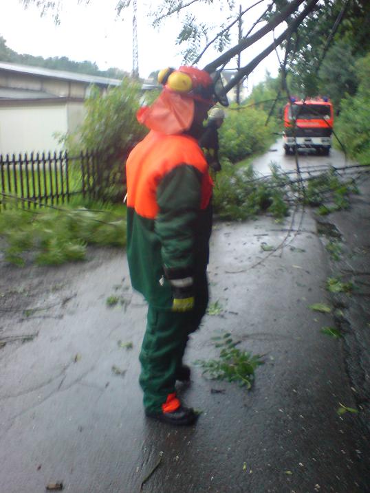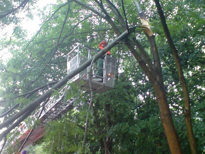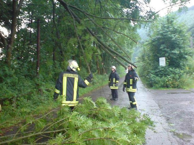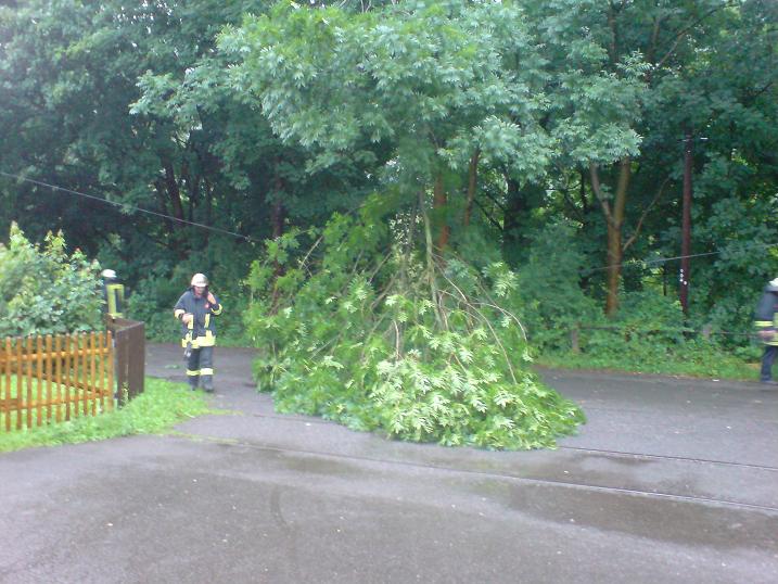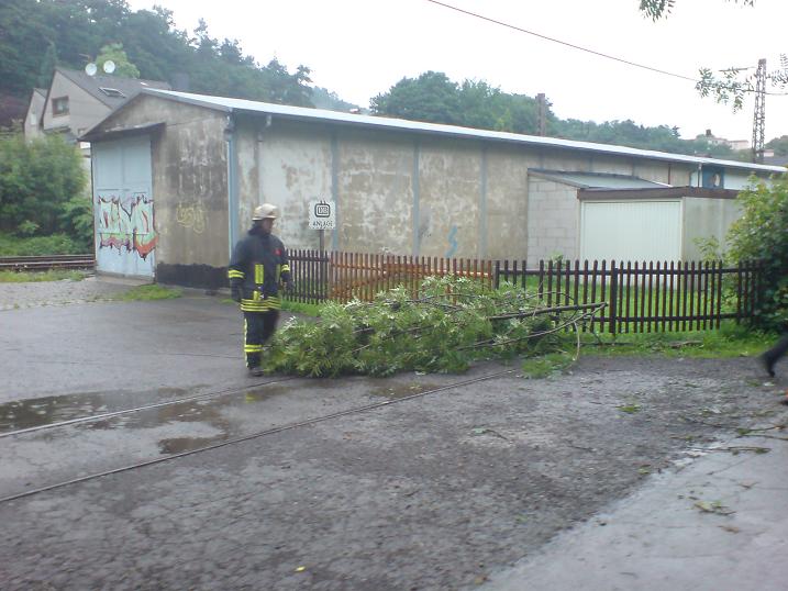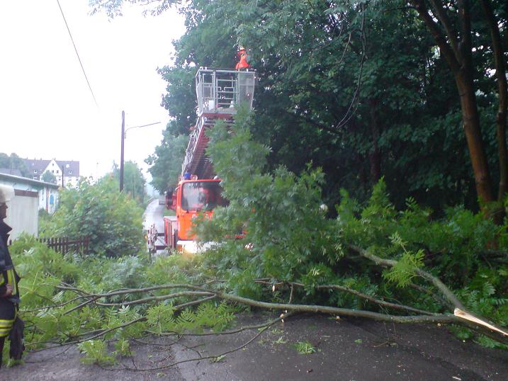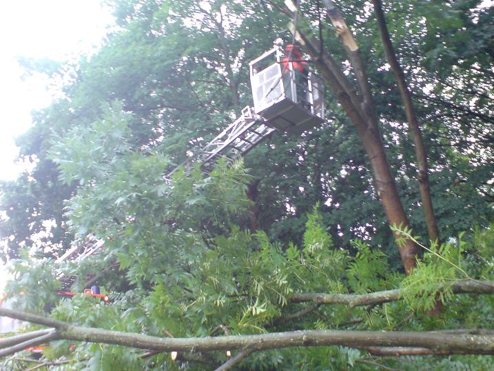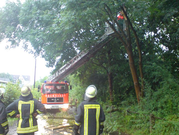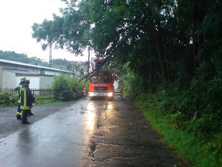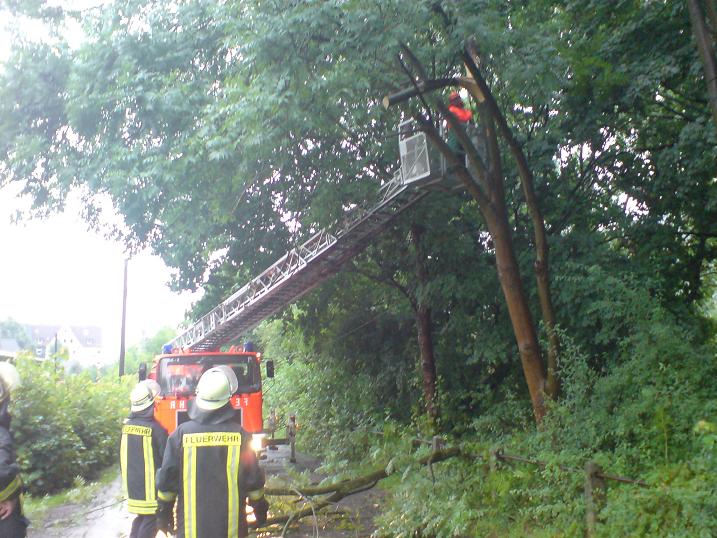 Gemeldet wurde ein umgestürzter Baum am Stenglingserweg .Die Löschgruppe Letmathe rückte mit dem LF 16 zur Einsatzstelle aus.In etwa 5 m Höhe war ein starker Ast abgebrochen,er hing über der Fahrbahn und mit den Spitzen in der isolierten Stromleitung der Straßenbeleuchtung.Mit der Motorkettensäge wurde das Astwerk soweit entfernt so das die Stromleitung wieder frei war.Um den Ast vollständig zu entfernen,wurde die DLK Letmathe nach gefordert. Aus dem Korb der DLK wurde dann der Ast am Stamm abgesägt.Die Fahrbahn wurde gesäubert und für den Verkehr freigegeben.