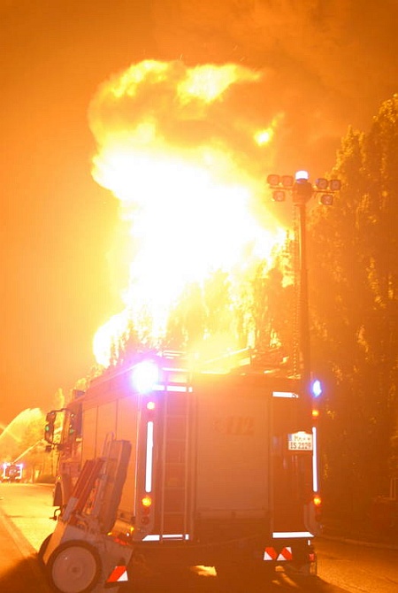 Die Drehleiter der Löschgruppe Letmathe wurde zum Großbrand der Firma Weka in Iserlohn Sümmern alarmiert. Vor Ort wurde das Wenderohr vorgenommen um angrenzende Gebäude vor den mächtigen Flammen zu schützen. Während des Einsatzes kam es zu weiteren Expolsionen.