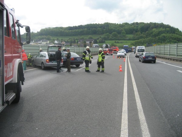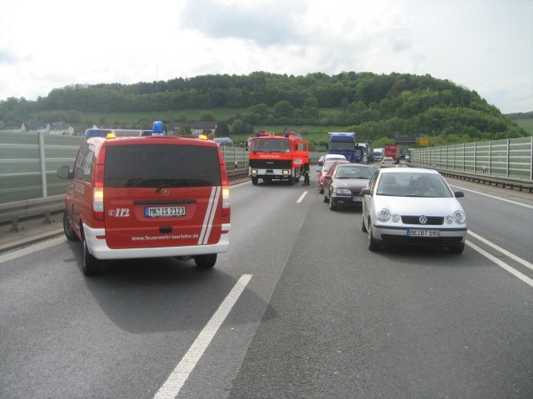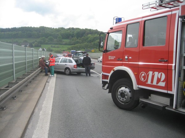 Gemeldet wurde ein Verkehrsunfall mit brennendem PKW und eingeklemmter Person. Zusätzlich zum Rüstzug der Berufsfeuerwehr wurde die Löschgruppen Letmathe und Stübbeken alarmiert. Vor Ort wurde festgestellt das kein PKW brannte und keine Person eingeklemmt war. Die Einsatzstelle wurde gegen den Verkehr abgesichert . Die Fahrzeuginsassen waren leicht verletzt und wurden vom Rettungsdienst versorgt. Aus den verunfallten Fahrzeugen liefen Betriebstoffe aus die von der LG Letmathe und der Berufsfeuerwehr mit Oelbindemittel abgestreut wurden. An beiden Fehrzeugen wurden die Batterien abgeklemmt. Anschließend wurde die Unfallstelle der BAB Polizei übergeben und alle Einsatzkräfte rückten wieder ein. Die LG Stübbeken brauchte nicht mehr ausrücken.