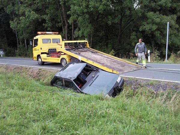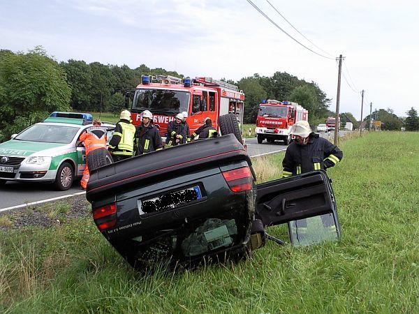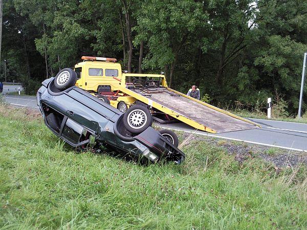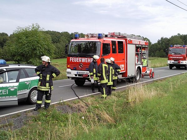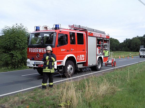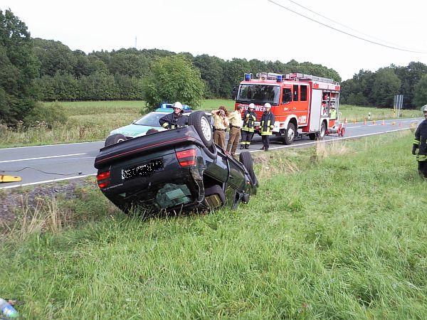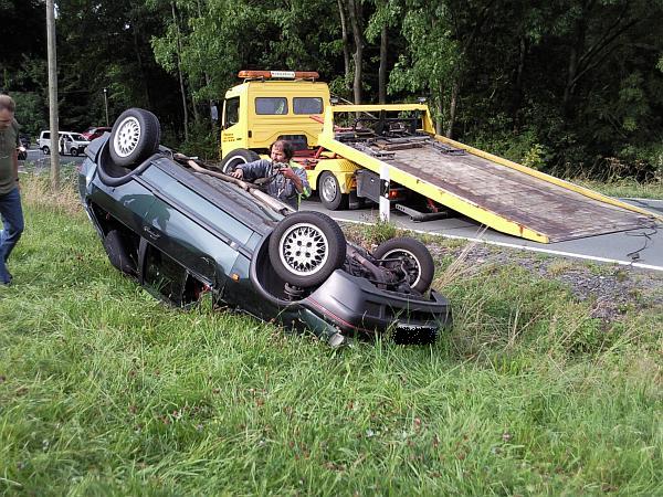 Vor Ort hatte sich ein PKW mit zwei Personen überschlagen. Diese hatten das Fahrzeug selbstständig verlassen und waren leicht verletzt. Die zwei Personen wurden dem Rettungsdienst übergeben. Durch die Löschgruppe wurde der Brandschutz mit der Schnellangriffseinrichtung und einem Pulverlöscher sicher gestellt. Nach der Fahrzeugbergung durch einen Abschleppunternehmer wurde die Straße noch mit Besen und Schaufeln gereinigt.