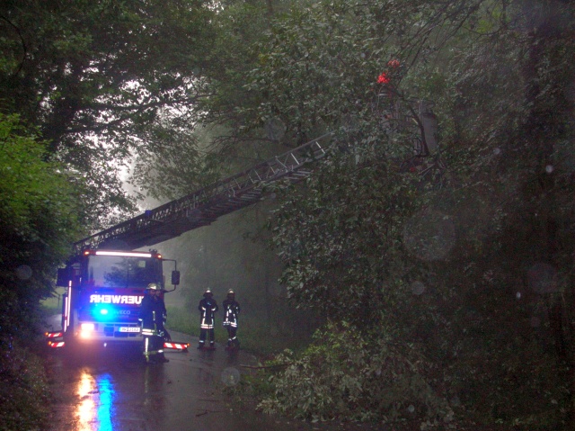 Auf der Grürmannsheider Str. ragte die Krone eines umgeknickten Baumes auf die Fahrbahn. Neben der Löschgruppe Oestrich wurde auch die Löschgruppe Letmathe alarmiert. Die Drehleiter wurde in Stellung gebracht und der Baum beseitigt. Die Polizei sperrt für den Einsatz die Straße.