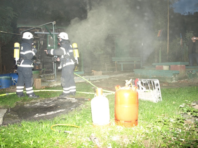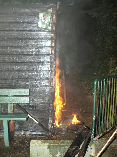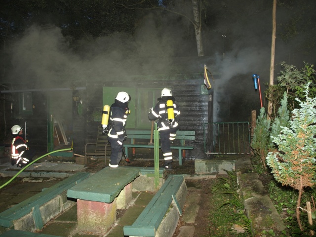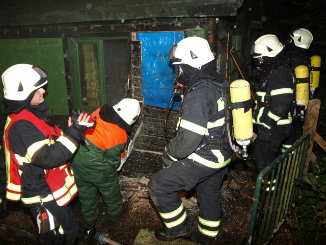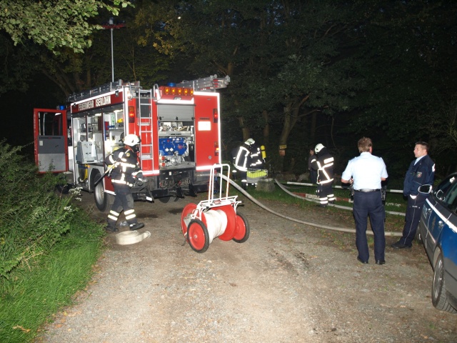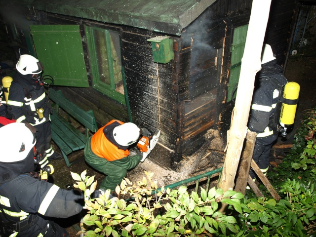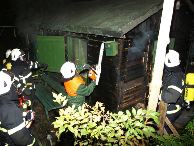 Die Löschgruppe Letmathe wurde zu einer brennenden Gartenlaube in die Bergstr. alarmiert. Beim Eintreffen der Einsatzkräfte aus Letmathe brannte die Außenwand einer Jagdhütte. Ein Trupp unter Atemschutz verschaffte sich gewaltsam Zutritt in die Innenräume und ging mit einem C-Rohr vor. Der Trupp fand zwei Propangasflaschen und brachte diese ins Freie. Parallel dazu bekämpfte ein weiterer Atemschutztrupp mit einem C-Rohr von außen die Flammen. Im weiteren Einsatzverlauf wurden die Wände der Hütte mit einer Kettensäge geöffnet und weitere Glutnester abgelöscht. Die Einsatzkräfte der Berufsfeuerwehr blieben derweil in Bereitstellung und stellten einen Sicherheitstrupp.