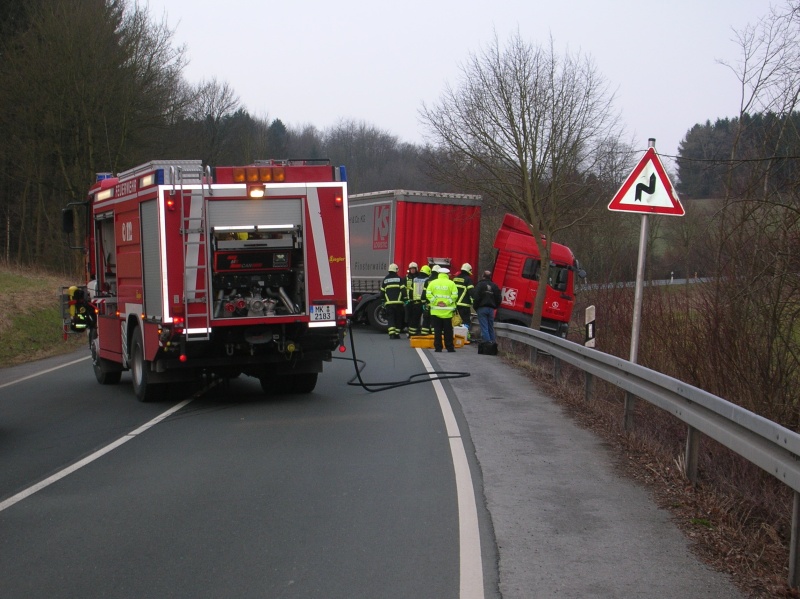 Der Löschzug 3 wurde zu einem aufgerissenen LKW-Tank zur Schwerter Str. gerufen. An der Einsatzstelle war ein Sattelzug von der Straße abgekommen und mit der Zugmaschine in den Straßengraben gerutscht. Während der Bergungsmaßnahmen durch einen Abschleppunternehmer war der Kraftstofftank des LKW aufgerissen. Dieselkraftstoff lief aus und versickerte im Erdreich.
