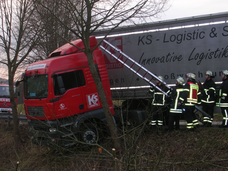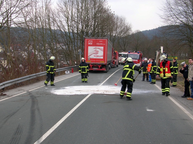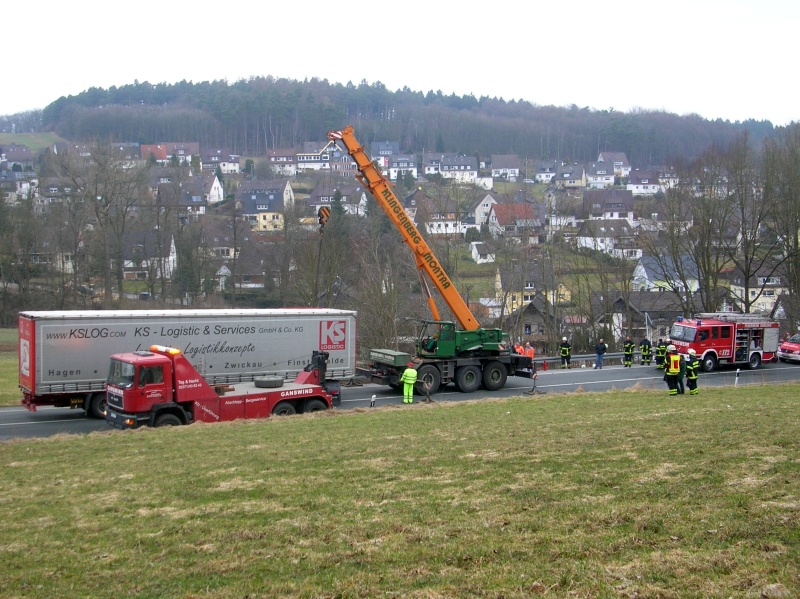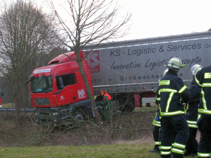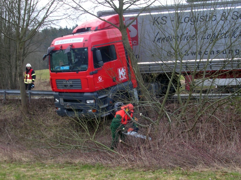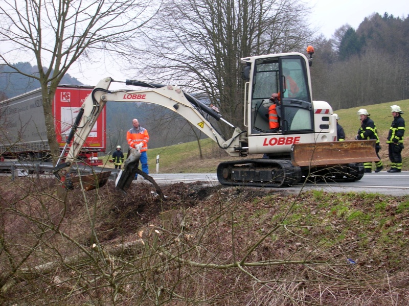 Für die Bergung der Zugmaschine mußte ein Baum gefällt werden. Nach der Bergung mit einem Kran wurde die Straße mit Ölbindemittel abgestreut und das Loch im Tank mit einem Holzpropfen abgedichtet.