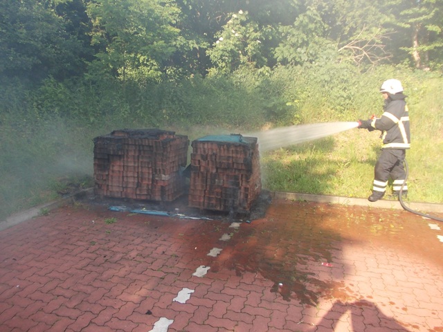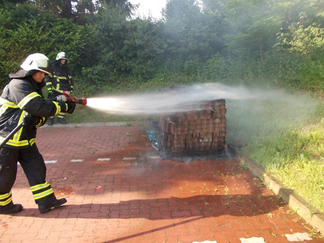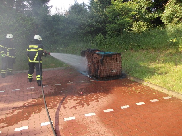 Das LF 16 der Löschgruppe Letmathe war auf der Rückfahrt vom Übungsdienst. Von der Einsatzzentrale wurde der Löschgruppe über Funk ein Feuer auf dem Aldi Parkplatz gemeldet. Auf dem Gelände brannten zwei Paletten, die von einem Trupp mit einem C Rohr gelöscht wurden.