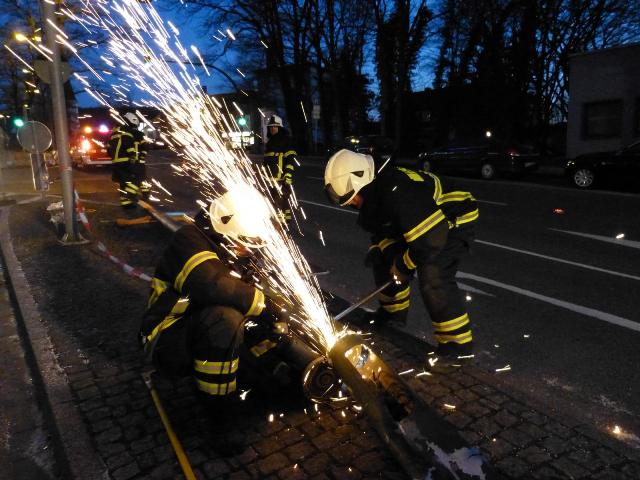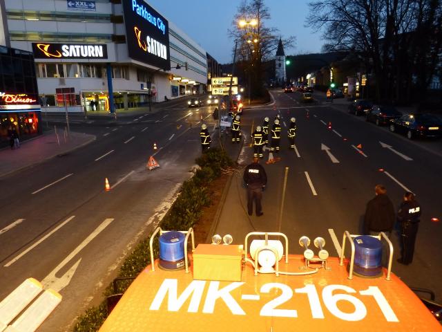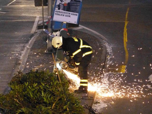 Auf dem Kurt-Schumacher-Ring hatte sich ein Verkehrsunfall ereignet. Da die Berufsfeuerwehr in einem anderen Einsatz gebunden war und das Löschfahrzeug der Letmather Löschgruppe gerade von dem vorherigen Einsatz wieder einsatzbereit war, wurde es zu diesem Einsatz alarmiert. Vor Ort war ein PKW gegen eine Straßenlaterne gefahren. Die Insassen wurden bereits vom Rettungsdienst versorgt. Die Einsatzkräfte des Löschfahrzeugs sicherten die Einsatzstelle, streuten auslaufende Betriebsmittel ab und entfernten die Straßenlaterne mit einem Trennschleifer.