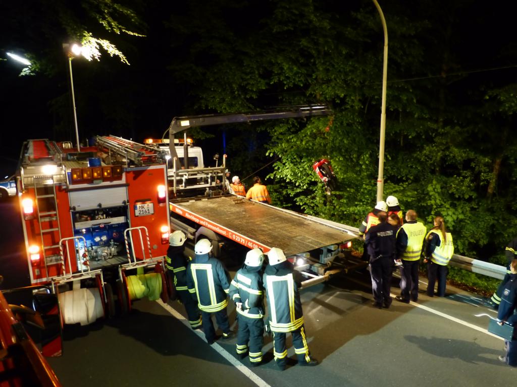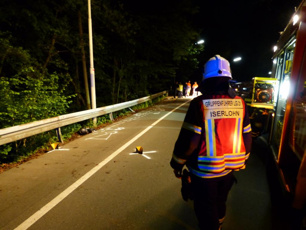 Am gestrigen Abend geriet ein Motorfahrer aus ungeklärte Ursache von der Fahrbahn und kollidierte mit der Leitplanke. Der Unfall ereignet sich auf der B236 (Schwerter Straße) Kurz vor der Einfahrt zum Stübbeken. Der Kradfahrer verletzte sich bei diesem Unfall schwer und musste mit dem Rettungswagen in ein Hagener Krankenhaus gefahren werden. Der eigentliche Rettungsdiensteinsatz war gegen 22:00 Uhr abgeschlossen. Da die mittlerweile eingesetzte Dunkelheit ein Unfallaufnahme für die Polizei unmöglich machte, wurde um 22.26 Uhr der Löschzug 3 der Feuerwehr Iserlohn alarmiert, um Beleuchtungsgerät an der Unfallstelle vor zunehmen. Die Löschgruppen Letmathe und Stübbeken rückten jeweils mit einem Löschfahrzeug aus. Des weiteren wurde die Drehleiter eingesetzt um die Einsatzstelle von oben Auszuleuchten. Nach der Unfallaufnahme konnte das Motorrad, welches eine steile Böschung runter rutschte, durch ein Abschleppunternehmen geborgen werden. Kurz vor 0:00 Uhr konnte der Einsatz als beendet erklärt werden. Die B 236 wurde zu diesem Zeitpunkt von der Polizei wieder Freigegeben werden. Die Bundesstraße war während der Rettung und den daraus resultierenden Maßnahmen, in beiden Richtungen vollgesperrt.