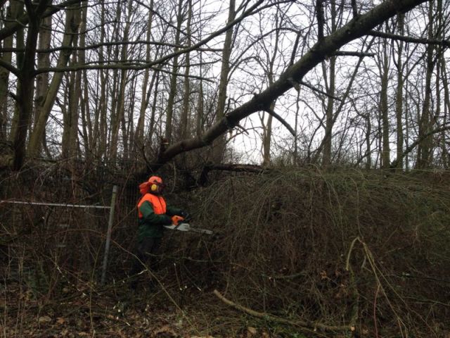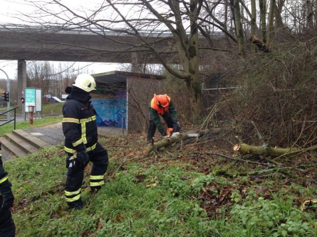 Zu einem umgestürtzten Baum wurde das Letmather HLF alarmiert. Der Baum lag auf einem Zaun und ragte über den Gehweg bis in die Fahrbahn der Schwerterstraße. Mit der Motorkettensäge wurde der Baum zersägt und zur Seite geräumt.