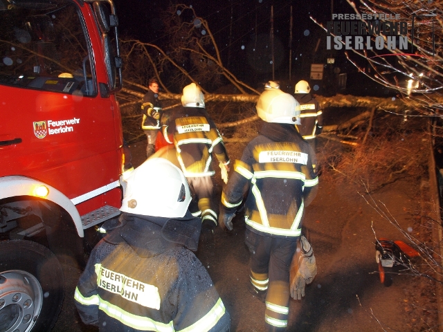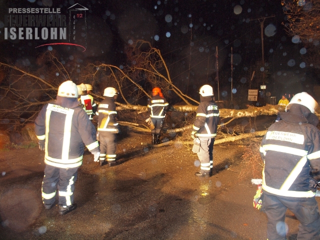 Zu einem umgestürtzen Baum auf einer Stomleitung wurde die Löschgruppe Letmathe alamiert. Nach eintreffen des Letmather HLF und dem ELW der Berufsfeuerwehr wurde die Einsatzstelle erkundet. Ein großer Baum lag auf eine freiliegende Stromleitung und hatte diese zu Boden gerissen. Ein PKW stand vor dem Baum. Dem Fahrer wurde angewiesen den PKW nicht zu verlassen. Der Energieversorger wurde zur Einsatzstelle gerufen um die Stromleitung Spannungsfrei zu schalten. Nach Freischaltung der Stromleitung wurde dann der Baum mittels Motorkettensäge zerlegt und zur Seite geräumt.
