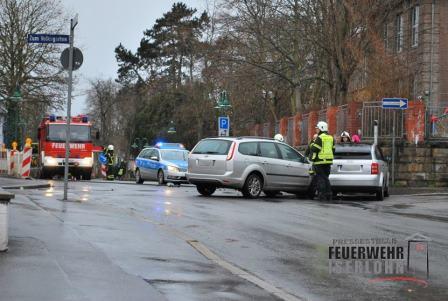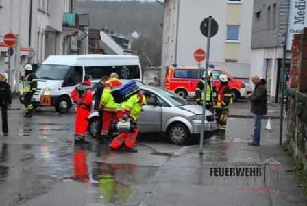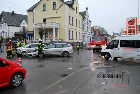 „Verkehrsunfall mit einer eingeklemmten Person auf der Friedrich-Ebert-Straße“ war die Meldung, die heute um 14:16 Uhr die Einsatzzentrale der Feuerwehr Iserlohn erreichte. Daraufhin rückten der Rüstzug und der Rettungsdienst der Berufsfeuerwehr zur Einsatzstelle aus. Im Kreuzungsbereich Friedrich Ebert Straße / Zum Volksgarten war es zu einem Verkehrsunfall zwischen zwei Fahrzeugen gekommen. Die Besatzung des HLF Letmathe und dem ELW BF trafen zeitgleich an der Einsatzstelle ein und erkundeten die Lage. Hierbei wurden zwei Personen leicht verletzt, mussten vom Rettungsdienst versorgt und in das Marienhospital transportiert werden. Glücklicherweise waren keine Personen eingeklemmt.