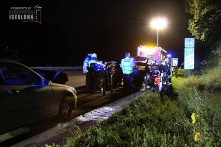 Um 22:53 Uhr wurden die Löschgruppe Letmathe zu einem Verkehrsunfall auf der Autobahn 46 in Fahrtrichtung Hagen, kurz vor der Anschlussstelle Elsey, alarmiert. Bei einem Auffahrunfall zwischen zwei Fahrzeugen wurden drei Personen verletzt. Eine Person musste mit Hilfe der Einsatzkräfte aus dem Fahrzeug schonend herausgeholt werden. Da Einheiten der Berufsfeuerwehren Iserlohn und Hagen schon vor Ort waren, wurde die Löschgruppe nach Eintreffen an der Einsatzstelle nicht mehr benötigt. Hierbei übernahmen die Kameraden der Berufsfeuerwehr Hagen die Rettung aus dem PKW, die Kameraden der Berufsfeuerwehr Iserlohn sicherten die Einsatzstelle derweil ab. Die verletzten Personen wurden mit drei Rettungswagen in die umliegenden Krankenhäuser transportiert.