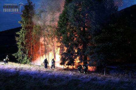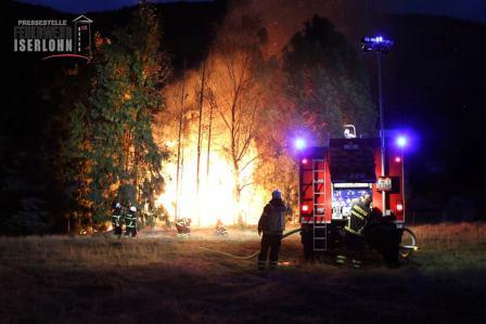 Mehrere Anrufer meldeten gegen 19:50 Uhr über den Notruf einen Brand im Bereich der Wulfeistraße in Iserlohn-Lasbeck. Bei Eintreffen des Löschzugs der Berufsfeuerwehr brannte am Ende der Wulfeistraße in einer Gartenanlage eine etwa 16 Quadratmeter große Gartenhütte in voller Ausdehnung. Weil die vorhandene Leistung der Hydranten in diesem Bereich für das Feuer zu gering war, wurden weitere Kräfte mit Wasserführenden Löschfahrzeugen der Freiwilligen Feuerwehr nachgefordert. Die Fahrzeuge gaben den Löschfahrzeugen vor Ort ihr Wasser ab und füllten die Tanks an einem Hydranten an der B 236 wieder auf. So pendelten die Fahrzeuge zwischen der Einsatzstelle und der B 236. Mit drei C-Rohren unter Atemschutz wurde der Brand bekämpft.