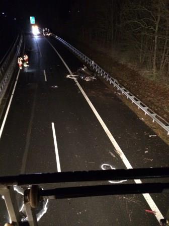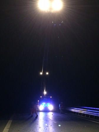 Die Besatzung der DLK leuchtete die Einsatzstelle aus und unterstützte damit die Polizei bei der Unfallaufnahme und die Aufräumarbeiten der Autobahnmeisterei.