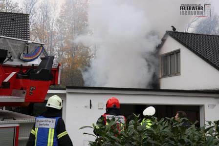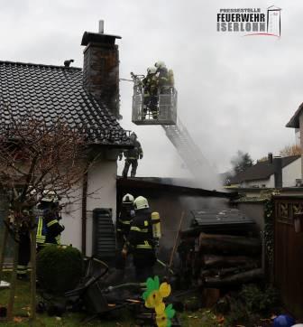 Der Gruppenführer der ersteintreffenden Löschgruppe Letmathe führte sofort Erkundungsmaßnahmen durch. Der Anbau einer Garage brannte in Voller Ausdehnung. Im ersten Angriff wurden 2 C-Rohre unter Atemschutz vorgenommen. Die DLK Letmathe wurde mit dem Wenderohr in Stellung gebracht. Ein weiterer Trupp ging mit einem C-Rohr über das Garagendach vor. Mit dem Einreißhaken wurde über die Drehleiter die Schieferverkleidung des Kamins entfernt. Durch den Einsatz von insgesamt 3 C-Rohren und dem Wenderohr konnte eine Ausbreitung auf das Wohnhaus verhindert werden.