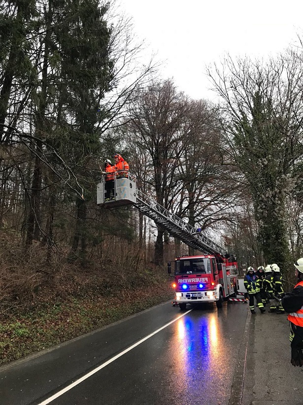 Die Löschgruppe wurde mit dem HLF und der DLK in die Oegert Straße alarmiert. Hier drohten mehrere Äste auf die Fahrbahn zu stürzen.