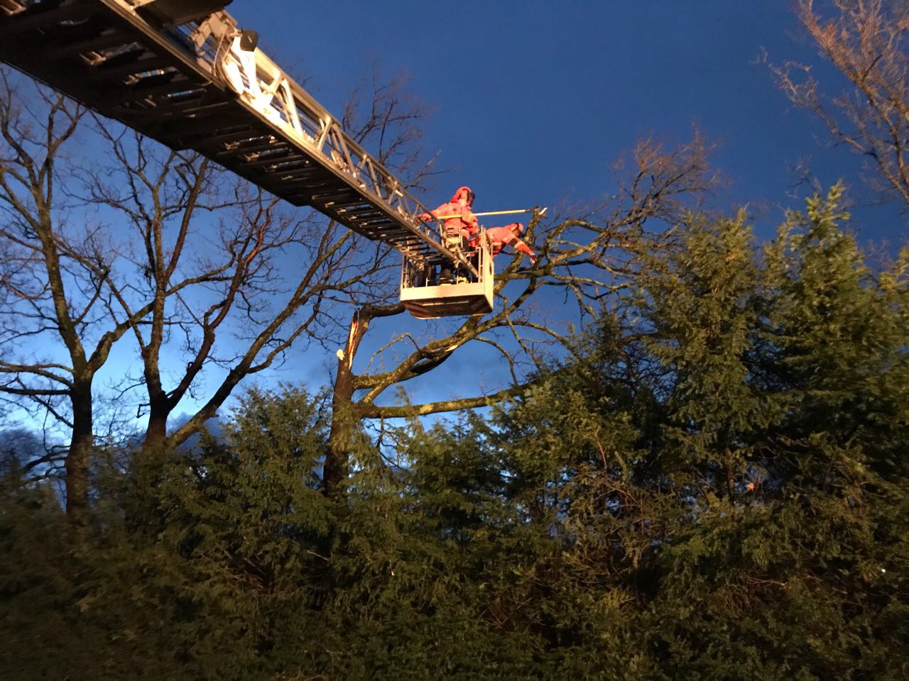Die DLK Letmathe wurde nachgefordert. Mit 2 Kettensägen wurden die Bäume zerlegt und am Straßenrand abgelegt.