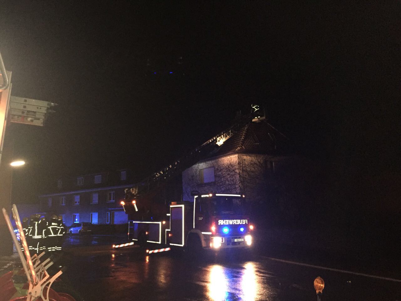 Das HLF wurde erneut in die Kilianstraße alarmiert. Hier lagen ebenfalls mehrere Dachziegel auf der Fahrbahn. Die DLK Letmathe wurde nachgefordert und das Dach kontrolliert. Lose Dachziegel wurden vom Dach entfernt.