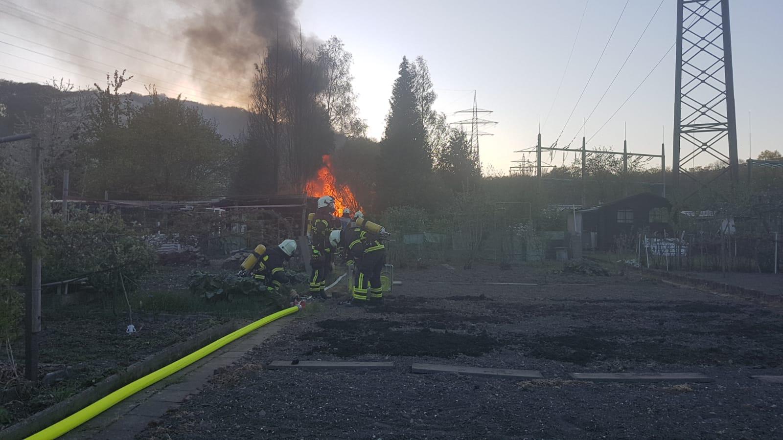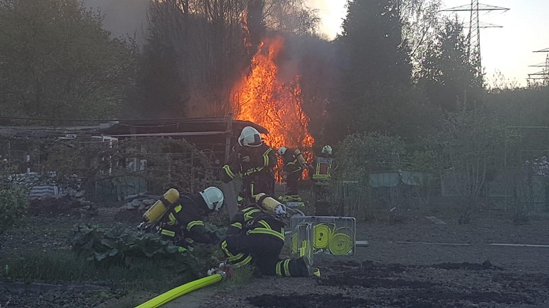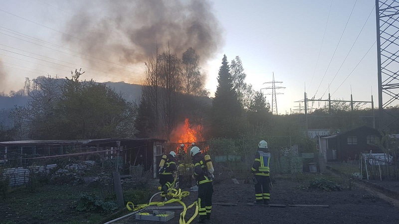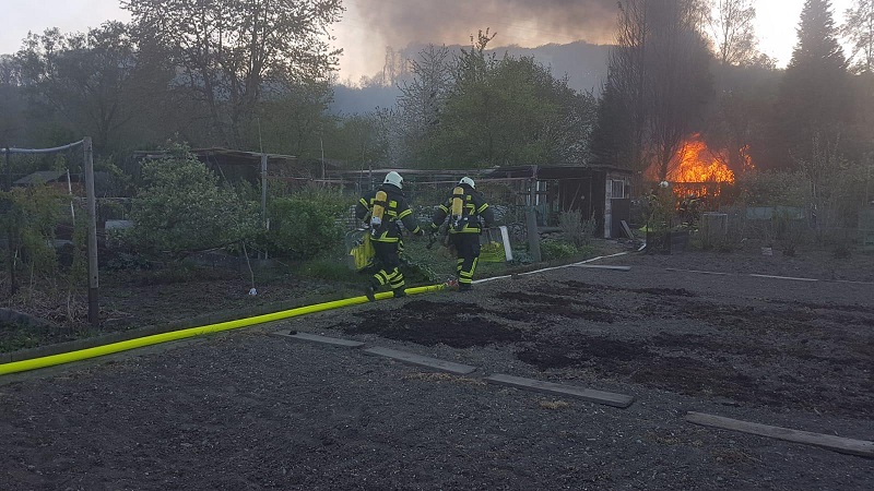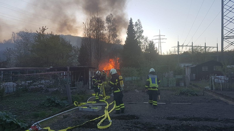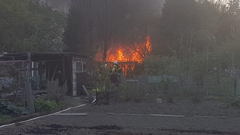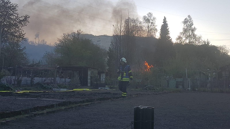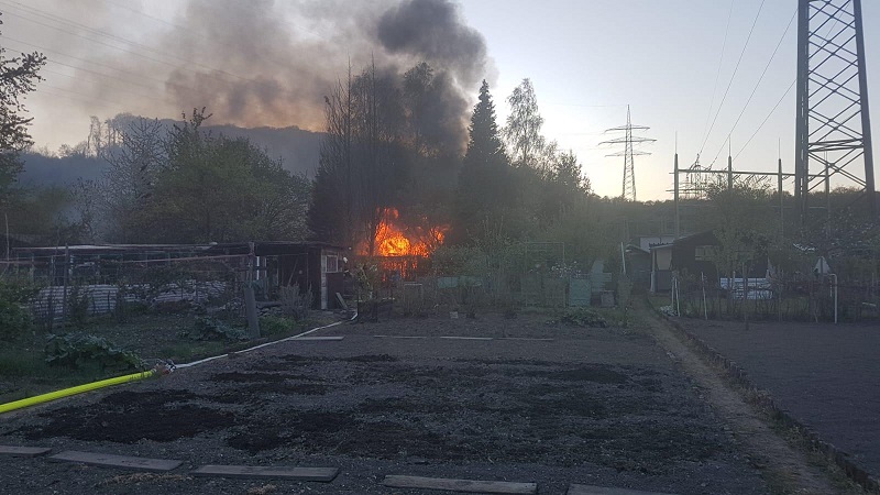 Das HLF Letmathe, das HLF und TLF der Berufsfeuerwehr wurden um 19:47 Uhr mit dem Stichwort "Feuer 0 brennt Tanne" in den Ortsteil Genna alarmiert. Da sich die Besatzung des HLF Letmathe noch von den Einsätzen 70/71/72 am Gerätehaus befanden und die Fahrzeuge aufrüsteten, konnte unmittelbar ausgerückt werden. Bereits auf der Anfahrt wurde eine massive Rauchentwicklung wahrgenommen. An der Einsatzstelle eingetroffen brannten mehrere Hecken und Tannen in einer Parzelle. Von dem HLF Letmathe wurden 2 C-Rohre im Außenangriff vorbereitet. Durch die rasante Ausbreitung auf Gartenlauben und eine Explosion wurde vom Fahrzeugführer Letmathe noch vor Eintreffen der Kräfte der Berufsfeuerwehr das Einsatzstichwort auf "Feuer 1" erhöht und somit die restlichen Kräfte des Löschzugs aus Iserlohn und das LF Letmathe/Stübbeken zur Einsatzstelle geordert. Im Verlauf mussten sich die Einsatzkräfte durch mehrere Parzellen vorarbeiten um an den Brandherd zu gelangen und das Feuer mit 3-Rohren zu bekämpfen. Die Brandursache wird durch die Polizei ermittelt.