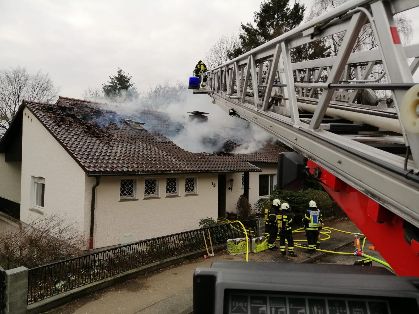 Vor Ort hatte sich ein Dachstuhlbrand entwickelt. Die Flammen schlugen bei Eintreffen der Löschgruppe bereits aus dem Dach. Eine Person wurde durch die Feuerwehr aus dem Gebäude gerettet und dem Rettungsdienst übergeben. Die Person erlitt Brandverletzungen und wurde einer Fachklinik zugeführt.