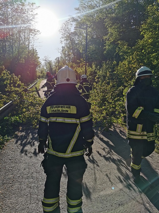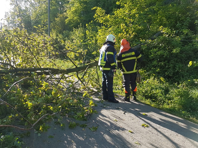 Hier war ein Baum durch die stärkeren Winde umgefallen und hatte die Oberleitung durchtrennt, sowie die Zufahrt zur Kleingartenanlage versperrt. Da das HLF der Berufsfeuerwehr kurzfristig zu einem anderen Einsatz umgeleitet werden musste, übernahm die Löschgruppe die Beseitigung des Baumes.