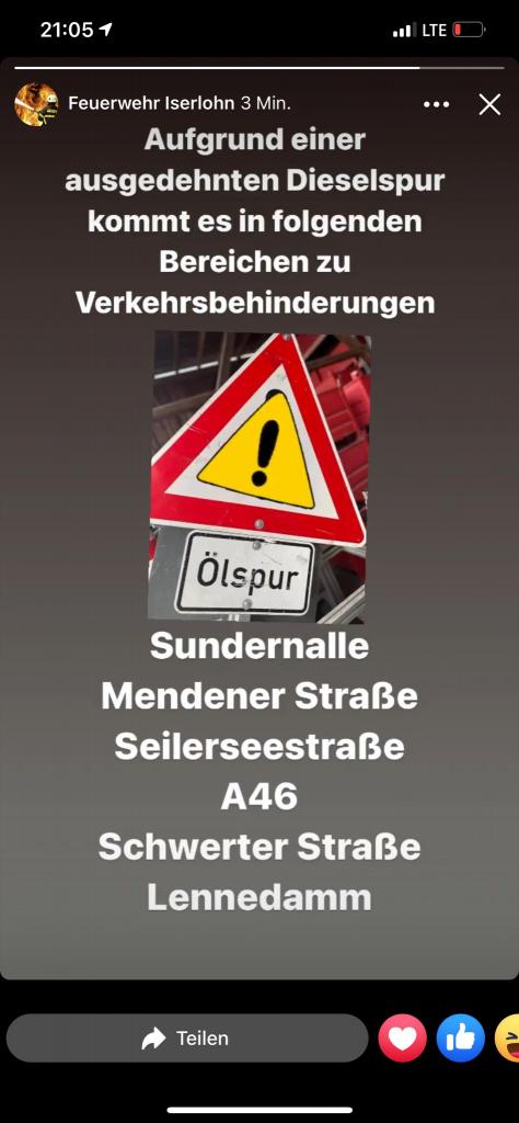 Weiter ging es dann für die Löschgruppe am frühen Abend. Es waren bereits mehrere Einheiten der Feuerwehr in Iserlohn im Einsatz. An unserem Gerätehaus am Lennedamm fuhr ein Fahrzeug vor. Der Fahrer gab an, dass er sich den Dieseltank während der Fahrt aufgerissen hatte. Seine Fahrstrecke begann in der Sundernallee in Iserlohn über die Mendener Straße, Seilerseestraße, Autobahn A46, Ausfahrt A46 in Letmathe, Schwerter Straße und endete am Lennedamm.