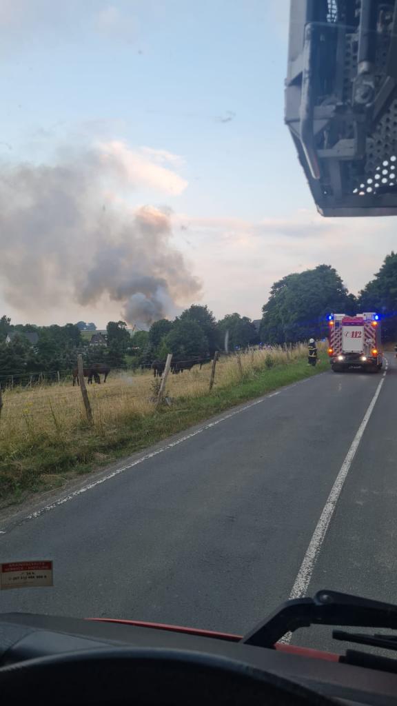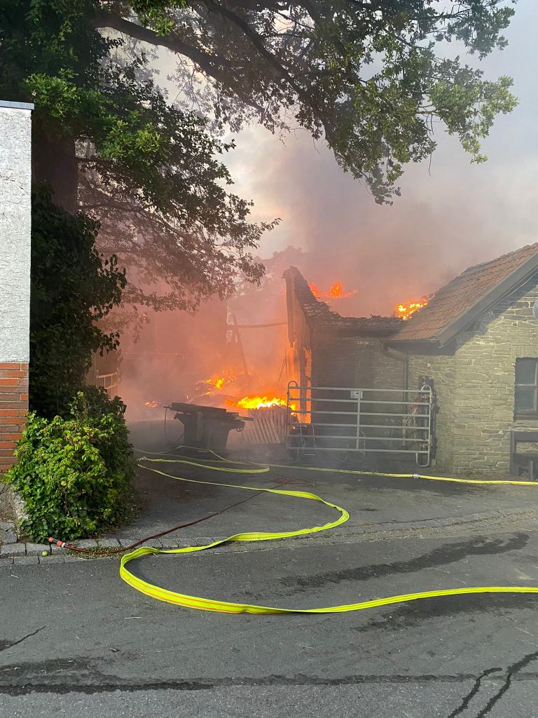 Dem ersteintreffenden Einsatzleiter stellte sich die Lage so dar, dass die Flammen bereits von den Heuballen auf die angrenzenden Gebäudeteile übergegriffen hatten. Sofort wurde das Alarmstichwort auf die Stufe 2 erhöht, was die Alarmierung weiterer Kräfte der Freiwilligen Feuerwehr Iserlohn mit sich bringt.