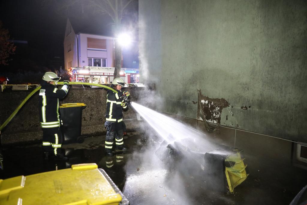 Das HLF Letmathe war nach wenigen Minuten an der Einsatzstelle und stellte fest, dass mehrere Mülltonnen an der Hauswand gebrannt hatten. Ein Trupp unter Atemschutz konnte das Feuer schnell unter Kontrolle bringen und die Mülltonnen von der Hauswand entfernen.