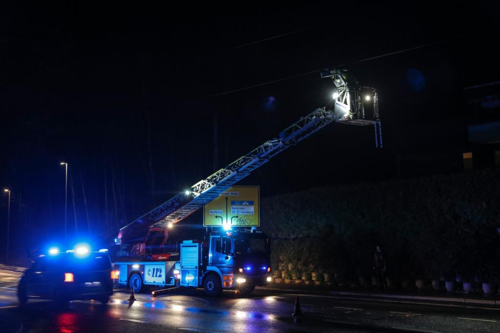 Die Drehleiter wurde durch die Polizei zur Baarstraße beordert. Eine beschädigte Straßenbeleuchtung drohte auf die Straße zu fallen. Zusammen mit den Stadtwerken wurde die beschädigte Straßenbeleuchtung entfernt.